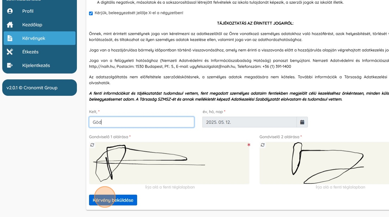 Egy gondviselő esetén egyszer kell aláírni. Aláírás után a KÉRVÉNY BEKÜLDÉSE