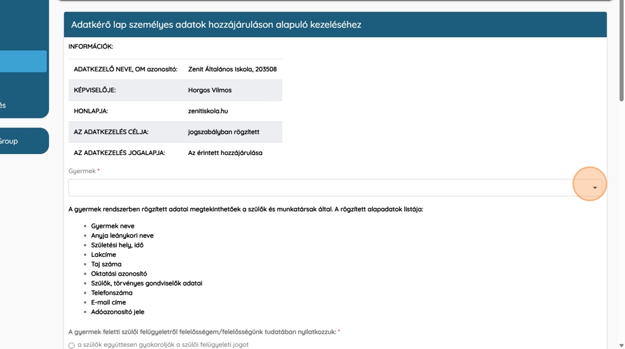 5 Megnyílik a kérvény. A Gyermek kötelező mezőből ki kell választani a gyermek nevét. A családi fiókok miatt itt minden a Zenitbe járó gyermek neve lejön.